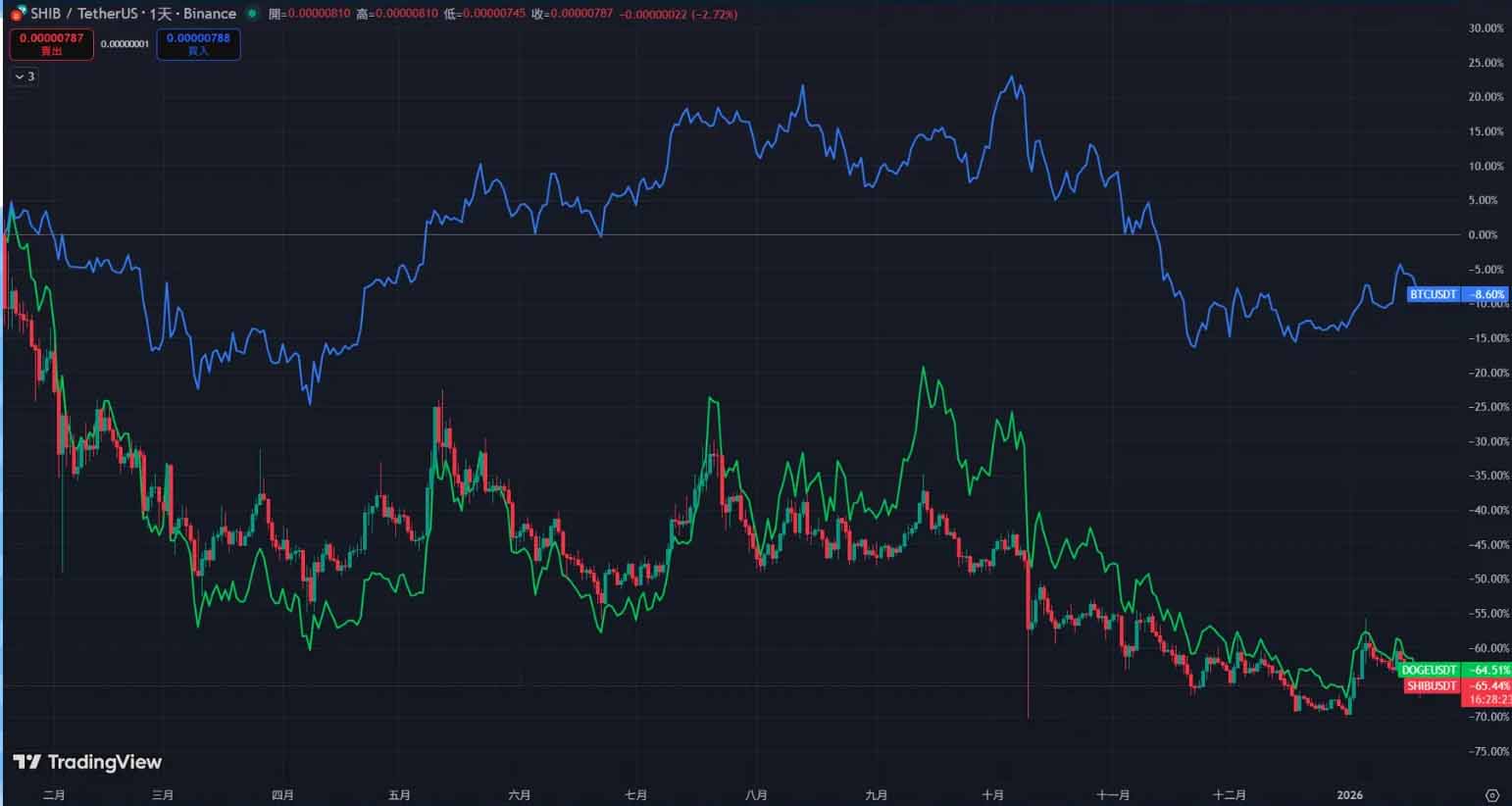 如果拉长时间来看,SHIB 的长期趋势明显不如 BTC,但略优于 DOGE。以下是截至 2026 年 1 月的实际数据:
