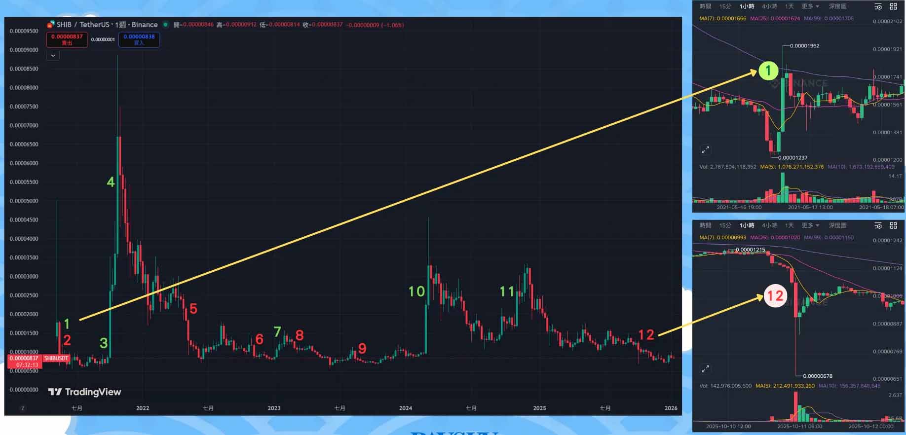 反应:消息传出后,整个市场大幅震荡,SHIB 也在短时间内暴跌,随着恐慌性卖压告一段落,价格也有稍微拉回。为了更直观地对照这些事件与价格变化,我在下面 K 线图上标注了上述事件的编号,大家可以对照标注来观察看看。