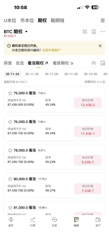 搜索“BTCUSDT期权” → 选到期日(e.g. 1周后) → 看Call行权价链。