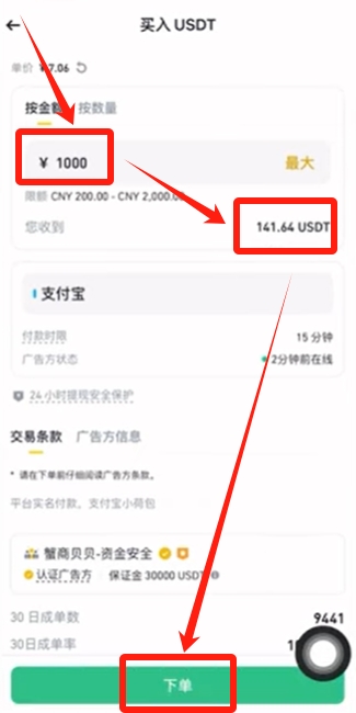 因为我们刚刚输入的是1000,他下方会自动为我们算出来,支付1000人民币将收到141.64颗USDT,然后点击下方的【下单】。