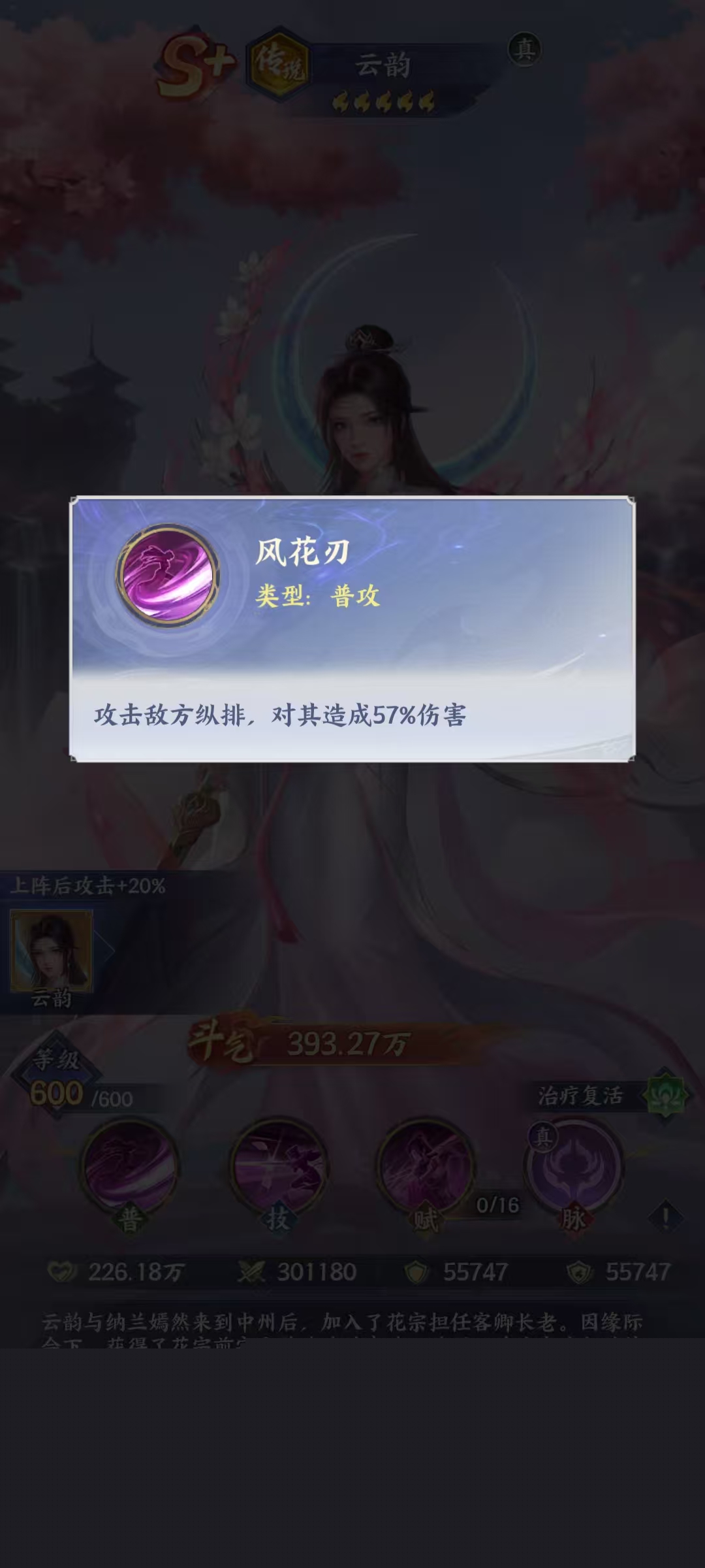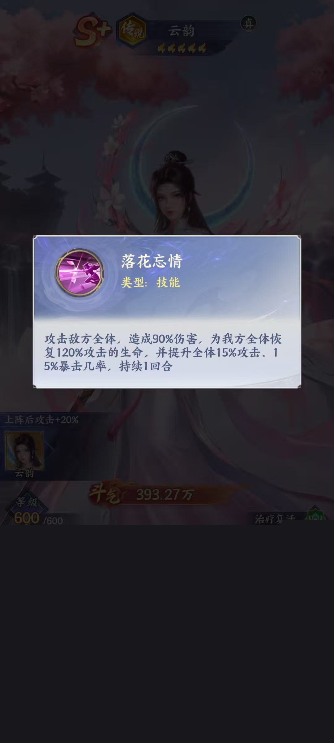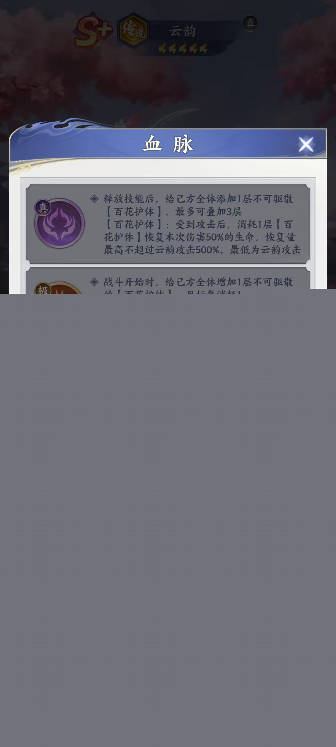 在战斗表现上,云韵的普通攻击虽基础伤害偏低,但可稳定触发“百花领域”被动——该效果使全队每次普攻命中后额外获得一次协同攻击,并附加持续回血效果。其主动技能“落花忘情”为关键输出兼辅助技:释放时对敌方全体造成高额法术伤害,同时按伤害比例为全体友方恢复生命值;配合“百花护体”开启后,可立即施加持续数秒的高额减伤护盾,显著提升团队承伤容错率。