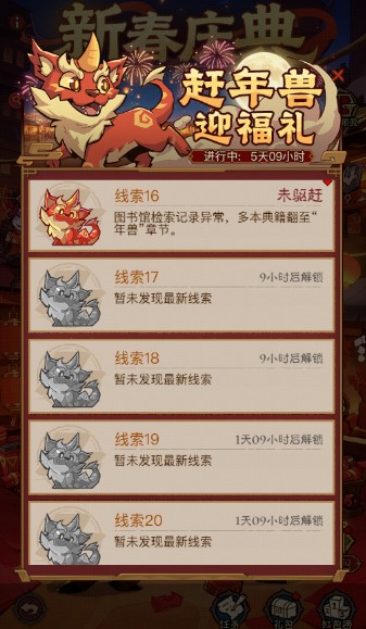 2.每日将会解锁小年兽的出没线索,分析线索前往固定地点可以赶走年兽。