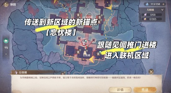 传送到新区域的新锚点【忘忧楼】,跟随见闻推门进楼进入联机区域