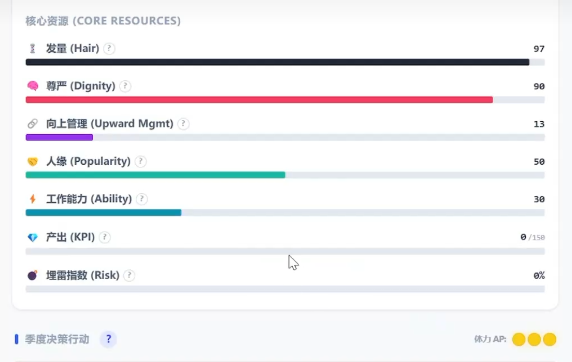 本作定位为“轻体量、重内容”的精品向模拟游戏。UI摒弃繁复动效与高饱和视觉堆砌,聚焦信息传达效率;美术风格统一采用低干扰配色与模块化布局,确保操作路径清晰直观。在简约表象之下,内置职业成长体系、项目周期管理、资源调配逻辑及随机事件链等多重机制,构建出具备长线可玩性的沙盒式职场推演空间。