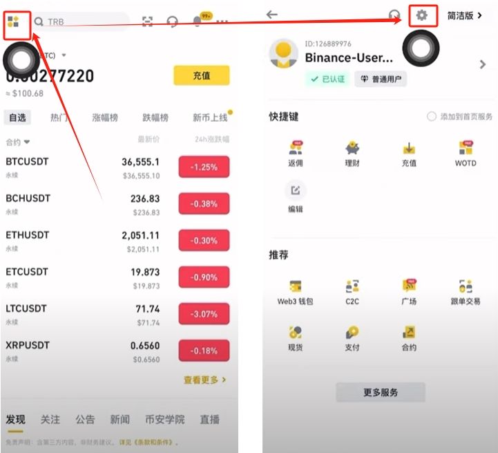 1点击币安左上角的图标,找到上方的“小齿轮”就是设置按钮,点击它。