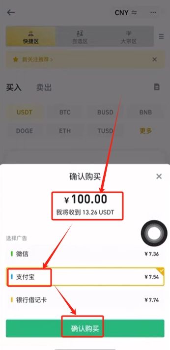 3.选择支付方式,它会告诉我们支付100人民币将收到12.26颗USDT。点击【确认购买】