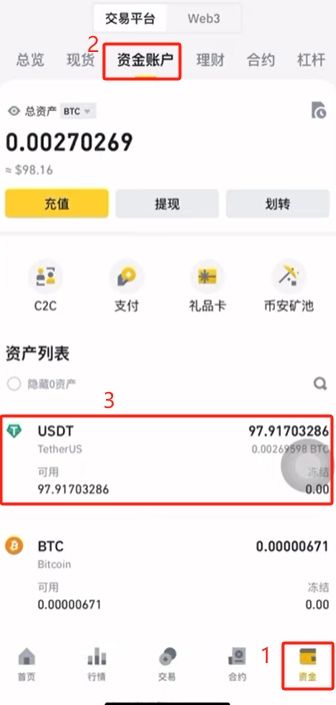 5.我们买好的USDT都会在资金账户里面,点击右下角的【资金】,上方选择【资金账户】,在这里就可以看到我们购买好的USDT了。
