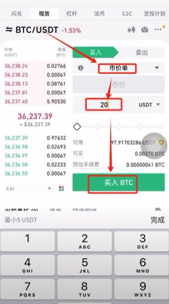 5.如果说你现在就想买,就可以选择【市价单】,市价单就是他会以当前市场最合适的价格给我们,直接输入要购买的金额就可以购买成功。输入“20”,点击【买入BTC】