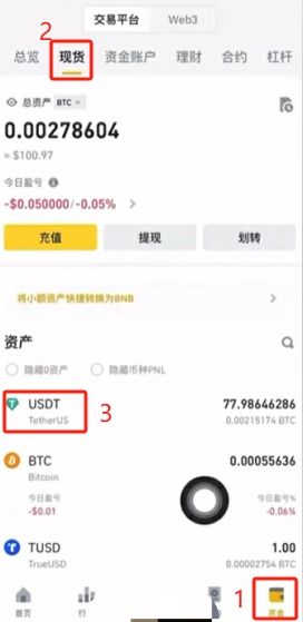2.把USDT划转到现货账户之后,我们才可以进行现货交易。点击下方中间的【交易】按钮,上方选择【现货】,在上方双箭头这里搜索我们想要兑换的币种。比如说你想买比特币,就在这里搜索BTC,BTC就是比特币的代码,选择第一个“BTC/USDT”,就是我们用USDT去兑换比特币。同样的,如果你想购买其他的币,都可以在这里搜索,然后使用USDT来兑换。