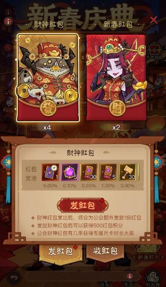 1.参与新春庆典可以获得财神红包以及新春红包,发送财神红包后公会可以额外获得1份相同的财神红包。