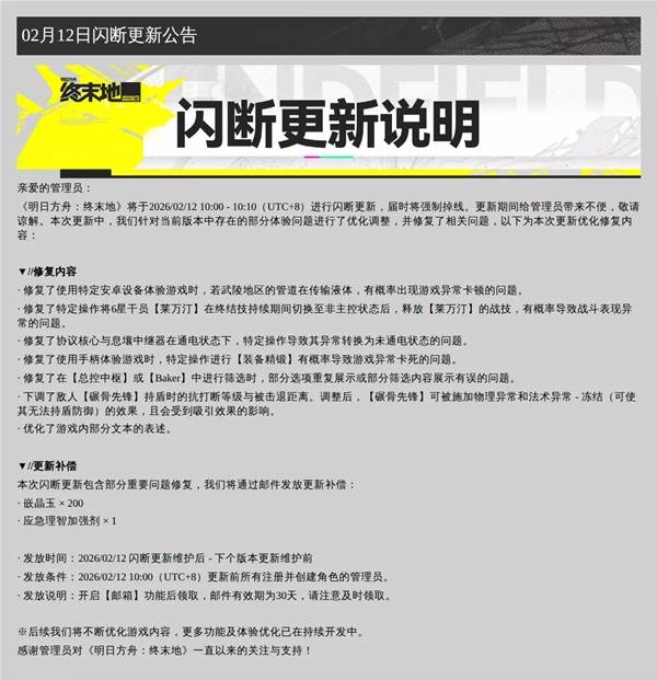 在明日方舟终末地中,出装是非常重要的一环。一个合理的出装顺序可以大大提高你的战斗力,为你在游戏中获得更多的胜利。今天,让我们一起来了解一下明日方舟终末地2月12日闪断更新公告。