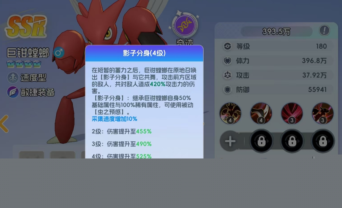战斗表现方面,巨钳螳螂在怒气值满时会瞬发“影子分身”,该分身拥有本体50%的基础属性,并同步向前推进发动物理攻击,形成双线压制效果,大幅提升瞬间输出效率。当等级提升至61级后,影子分身还可协同触发被动技“充之预感”,额外获得攻击力加成;同时,在自身血量低于50%时,自动激活1秒无敌状态,生存韧性显著增强。此外,其突击能力随等级逐步解锁:11级开放后排突袭技能,可无视前排直接切入敌方后排造成伤害;41级习得连斩后,还将永久提升闪避率,大幅降低被命中概率,实现高机动性下的稳定输出。