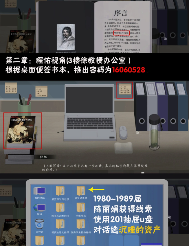 3、程佑视角(3楼徐教授教室)根据椅子上纸团便签和门口桌面本子线索,在平板输入卡拉瓦乔,获得信息后和成功徐教授对话去办公室