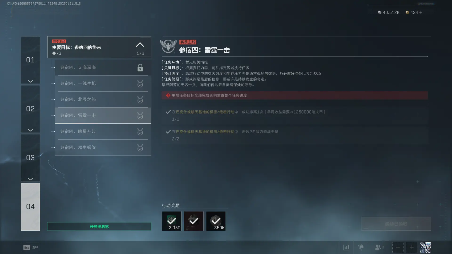 1、在巴克什或航天基地的机密/绝密行动中,成功撤离1次(单局收益需要≥1250000哈夫币)。