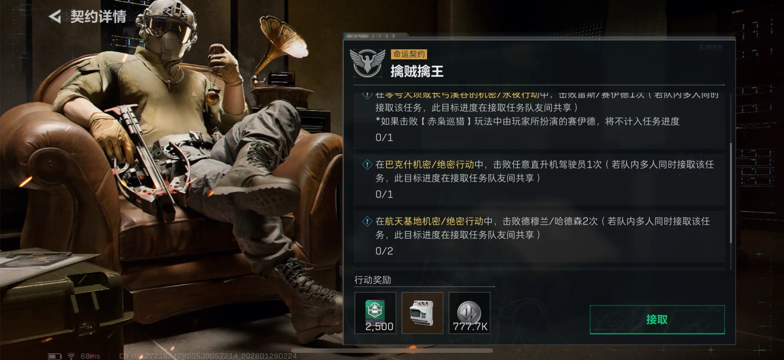 在航天基地机密/绝密行动中,击败德穆兰/哈德森2次(若队内多人同时接取该任务,此目标进度在接取任务队友间共享)