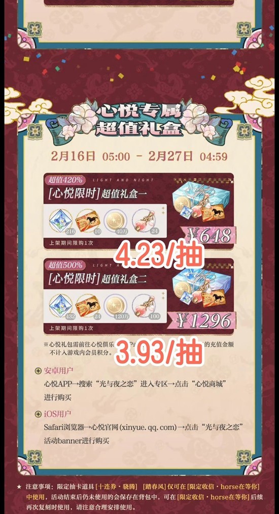 光与夜之恋新春限定收信「horse 在等你」为五位男主专属六星灵犀混池,中式红装造型,动态效果与专属剧情拉满。卡池概率 UP,结束后不进入常驻。活动可免费领取大量抽卡道具,100 抽可自选男主,那么这一卡池怎么氪金呢?为你准备了一份攻略,一起来看看吧~