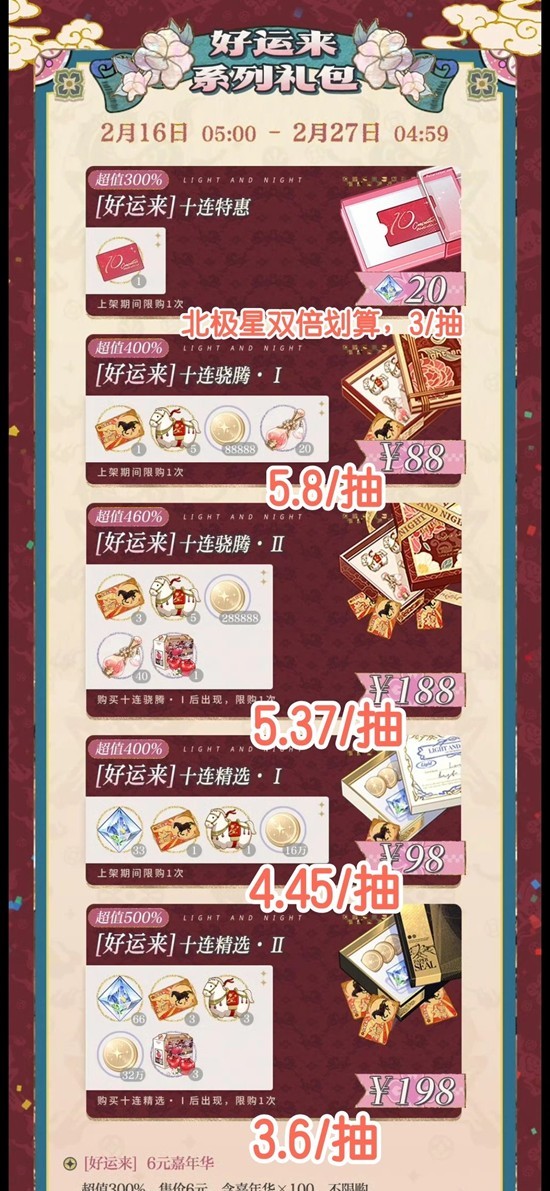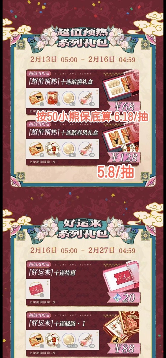 (十连精选按1北极星100小熊大致算的,如果换10连+活动期间100小熊礼包+常规50小熊,且十连精选①②都拿下是是 3.74/抽) 建议入手