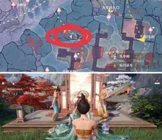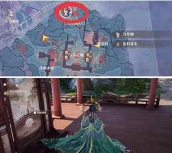 从九华阙右手边走,爬上坡到达位置会看到三个跳舞的NPC,按要求摆放图案即可。