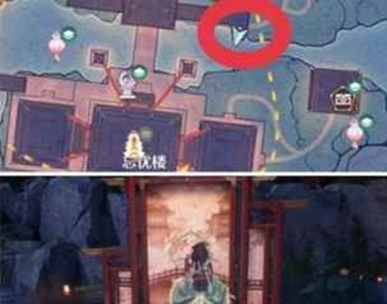 最近传送点为忘忧楼,往万乡之飨方向走,走至图示位置即可找到。