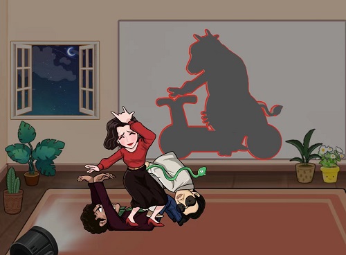 3、将右侧的“雨伞”给另一个,点击打开雨伞出现蝙蝠影子;