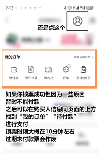 8. 若锁票后未及时付款,可在"我的订单-待付款"中补缴,锁票有效期约10分钟