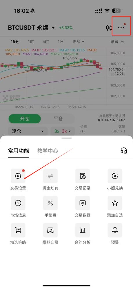 欧易用户需手动开启双向持仓功能,具体流程为:登录APP后点击左上角个人中心,选择合约交易模块进入设置界面。