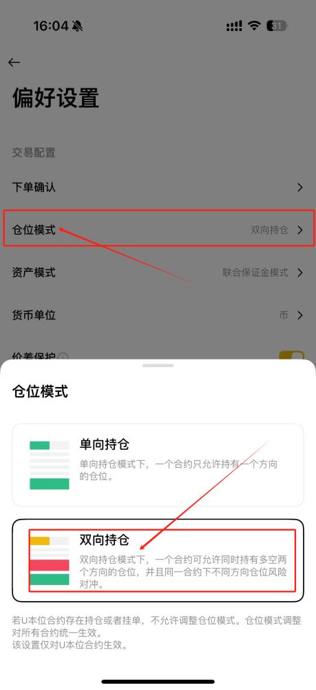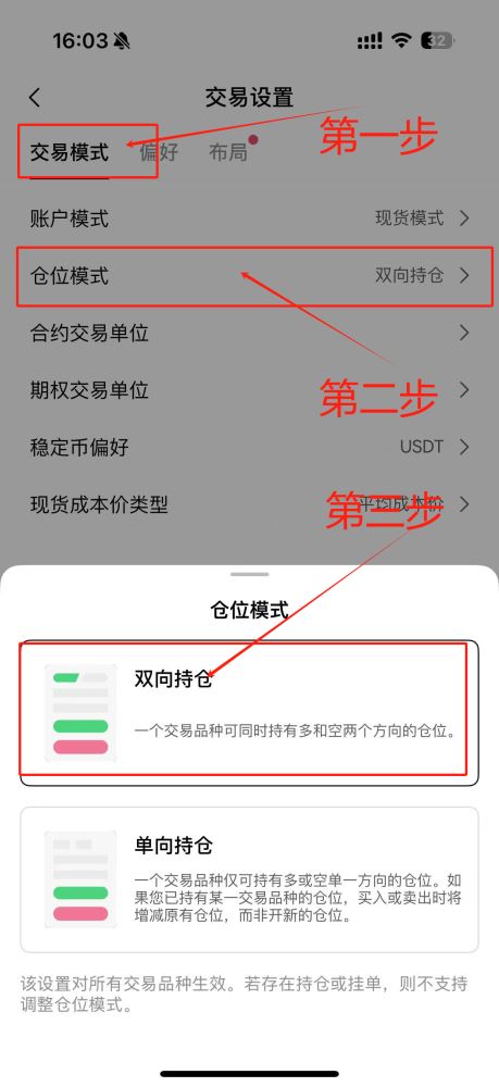在交易设置菜单中找到仓位模式选项,将其切换为双向持仓状态即可完成配置。