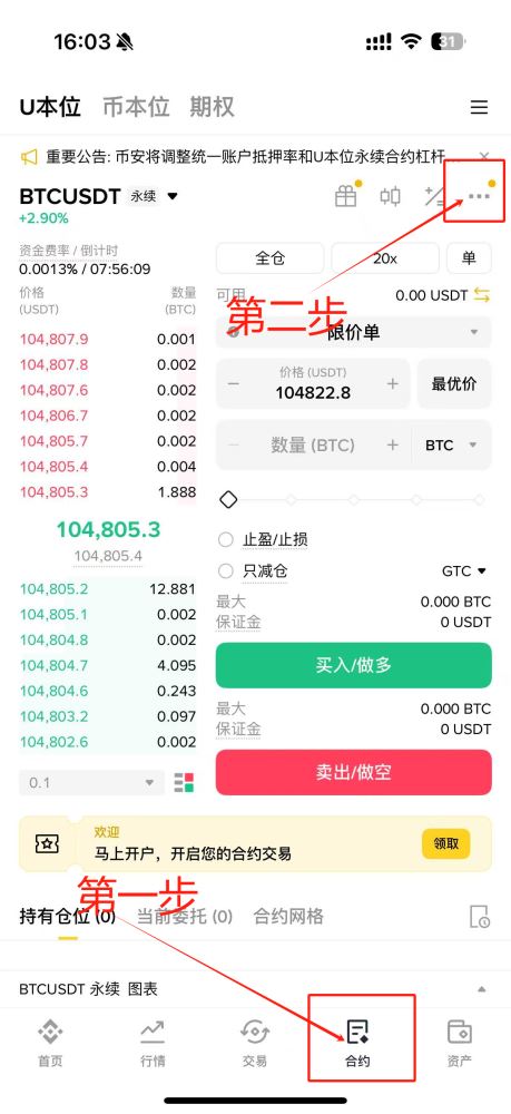 未开通合约账户的用户需先行开通,随后在仓位模式选项中激活双向持仓功能。