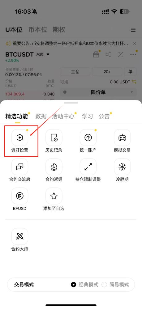 币安平台新用户默认开启该功能,如需调整可进入合约交易页面,点击右上角设置图标进入偏好设置界面。