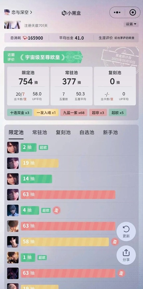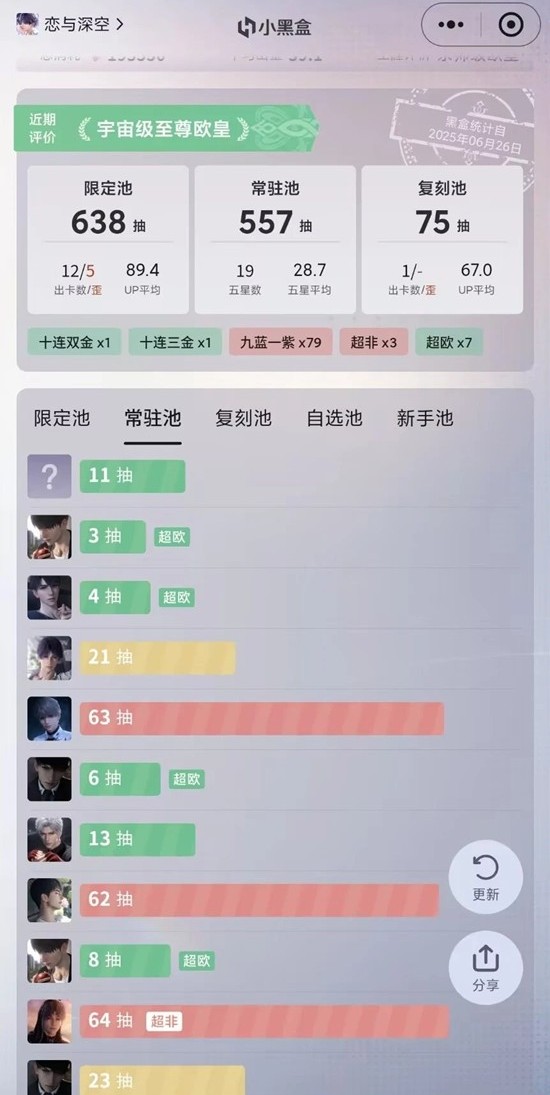 常驻两个十连抽完立马抽限定池。这个方法慎用,因为很容易欧在常驻池,我两个号用这个方法在常驻的时候都出了双金三金,遗憾退出