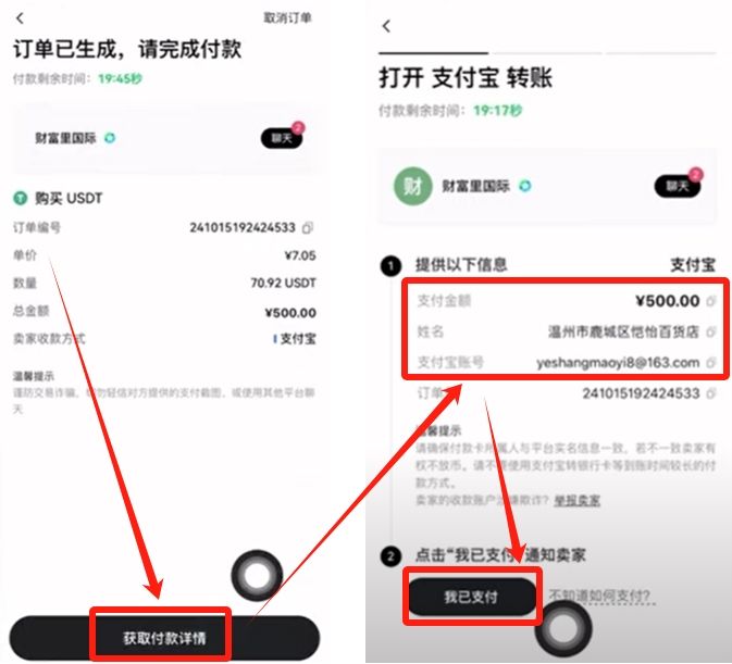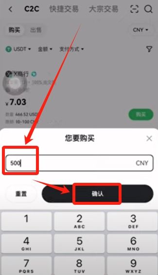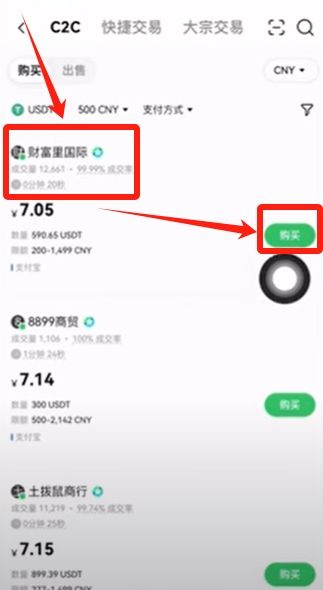 认证完成后点击C2C买币功能,选择支付金额与方式。平台会展示优质商家信息,建议选择高成交量高好评率的商家进行交易。