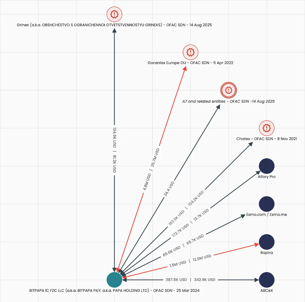 共享基础设施表明实际运营未分离,使面向俄罗斯平台的资金与西方实体混同。Exmo曾与Garantex、Grinex和Chatex进行交易。