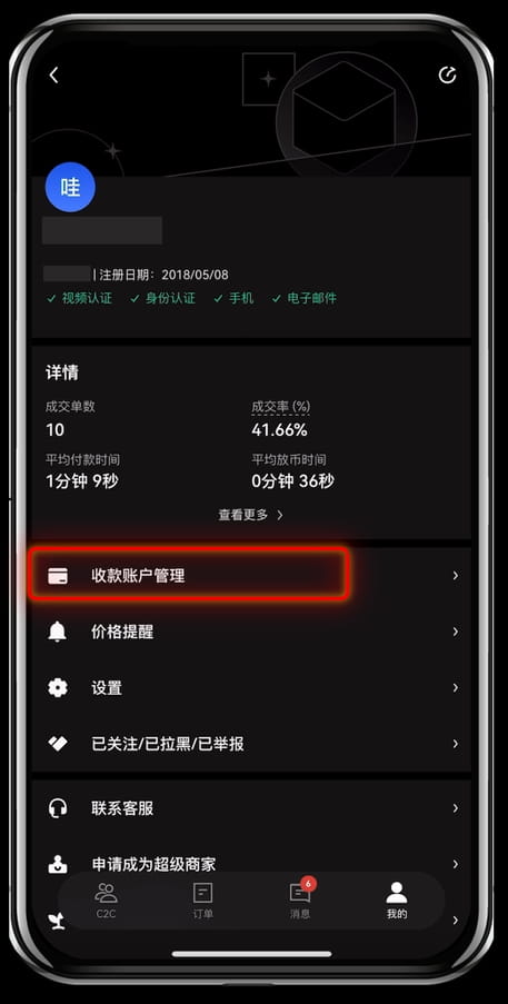 5. 完成认证后进入C2C交易界面,通过收款账号管理功能添加储蓄卡信息。系统支持多种主流支付方式绑定。