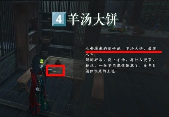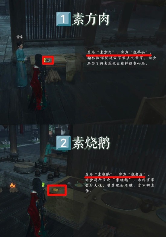 2.进去厨房先与青棠对话,试吃素方肉,然后按照图位置偷吃素烧鹅,大救驾,羊汤大饼共四种食物