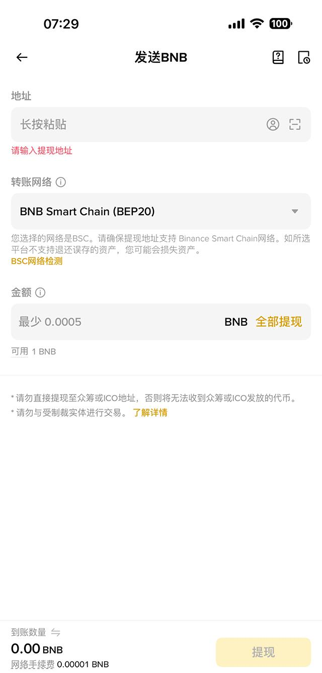 在 BSC 上转账需要支付少量BNB币作为 Gas 费。确保你的币安账户或接收钱袋里有足够的 BNB 来支付这笔费用(提币时 Gas 费从提币额中扣除,通常只需几分钱到几毛钱 USD 等值的 BNB)。