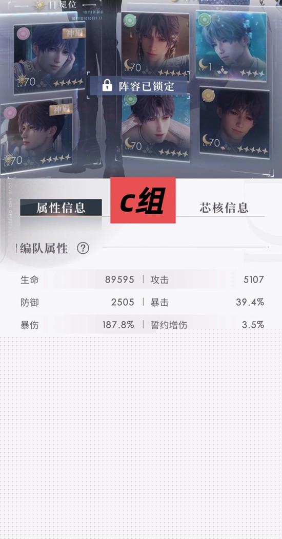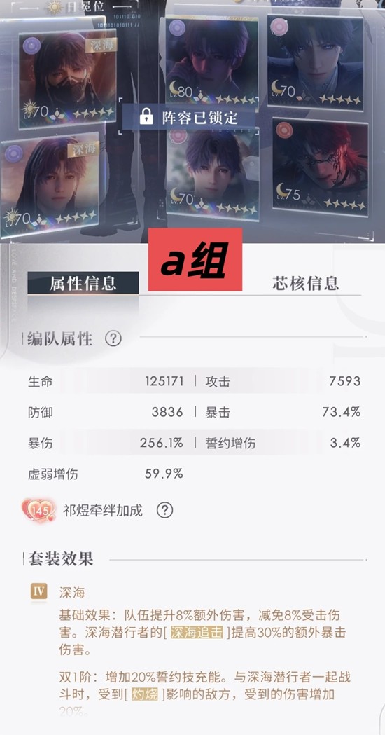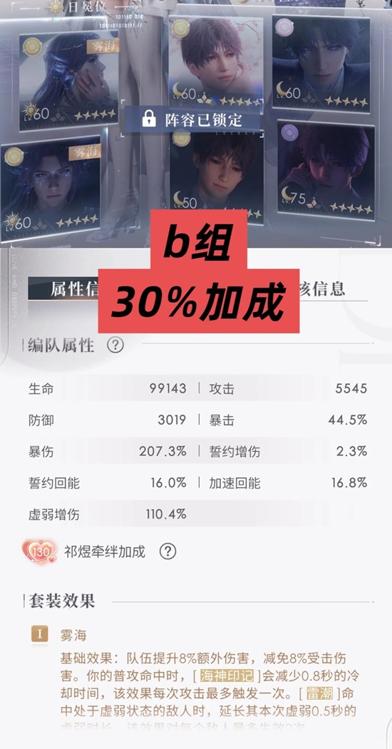 全使用雾海搭档。但是整体面板都是有溢出的,我是懒鬼就这样吧()。除了b组,b组该号是一阶雾海顺谱所以大溢出,就拿另一个号30%加成的零阶雾海卡秒过面板作为参考。