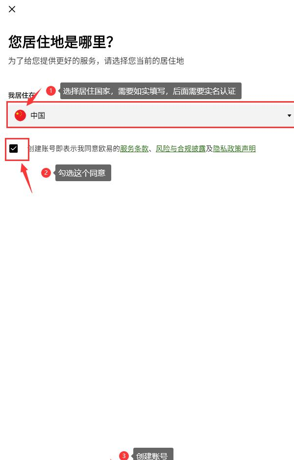 需确保填写的居住地址与所选国家一致,该信息将用于后续身份验证环节。