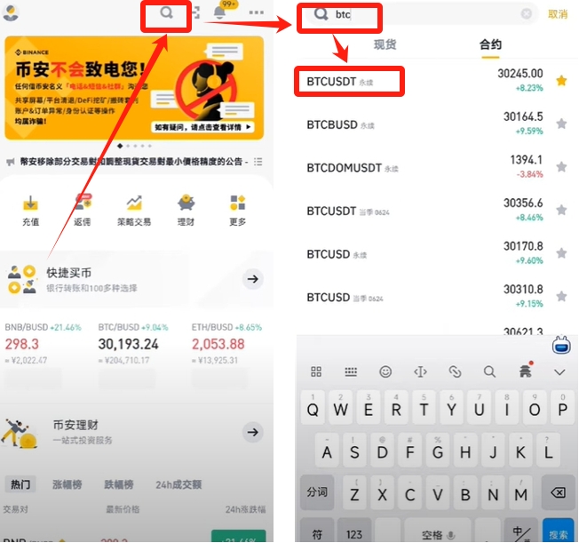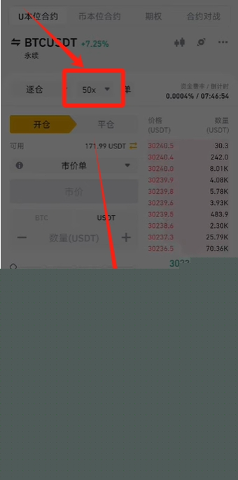 通过交易界面顶部的双箭头图标可切换不同币种合约,支持BTC/USDT等主流币种永续合约交易。直接在搜索栏输入目标币种如BTC,即可快速定位交易对。