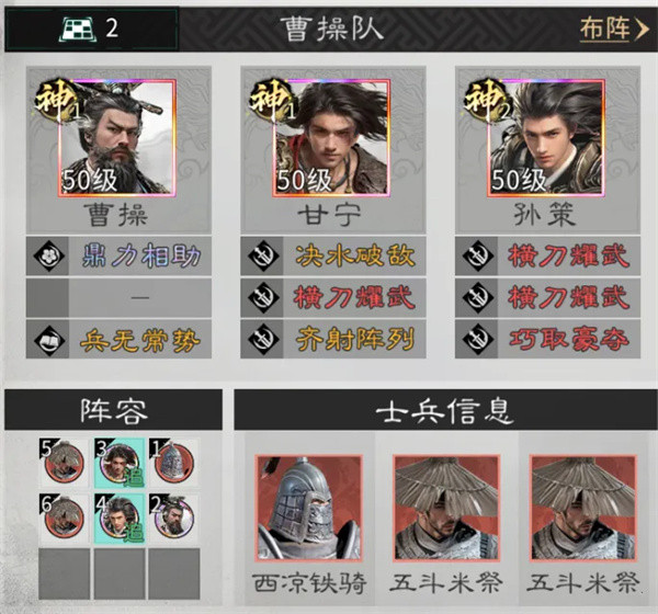 兵种站位:在曹操的上方放置一个西凉铁骑,在甘宁和孙策身后各放置一个五斗米祭。
