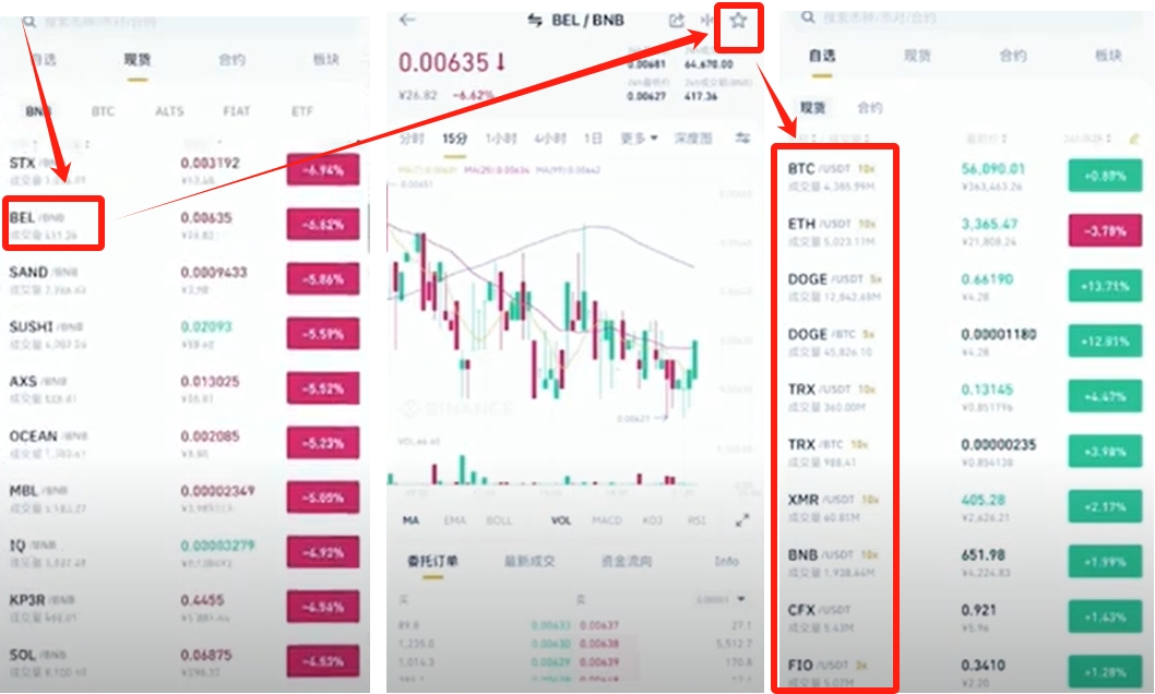 行情板块可实时查看数字货币价格波动,点击对应币种进入详情页可查看深度数据。通过点击右上角星标可将常用币种添加至自选列表。