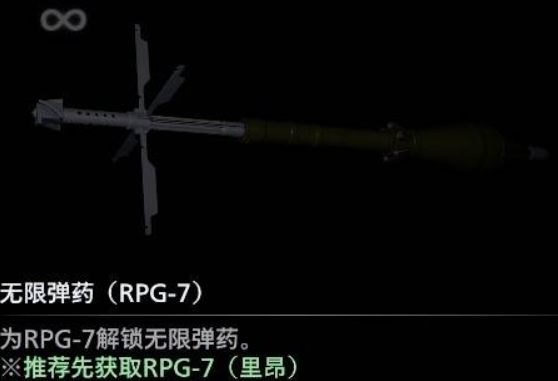 【无限弹药(RPG-7)】需要先购买解锁【RPG-7】,然后从补给箱中取出RPG-7才能在设置界面启用并生效。