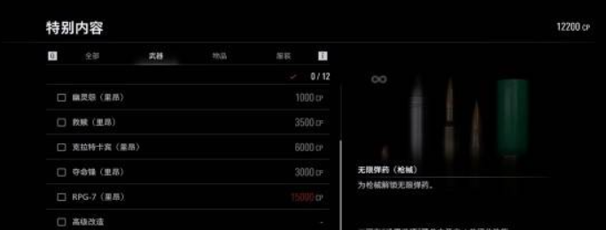 本作的无限武器包含【无限耐久-小刀】、【无限弹药-枪械】、【无限弹药-RPG】、【无限耐久-斧头】。枪械类武器的无限弹药需要消耗5万CP点数解锁,成本相当高昂,建议通过完成挑战来快速积累CP点。