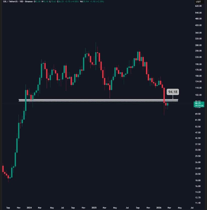 关键支撑转阻力位后,Solana在94.20美元面临决定性阻力。来源:Crypto Chiefs via X