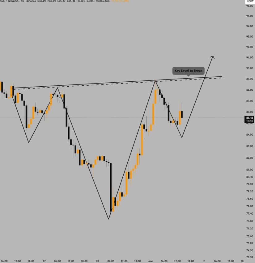 Solana价格在温和反弹后交投于84.41美元附近,但由于价格仍处于关键支撑转阻力区下方,整体结构仍承压。虽然短期图表显示积极形态,但市场整体仍保持波动。