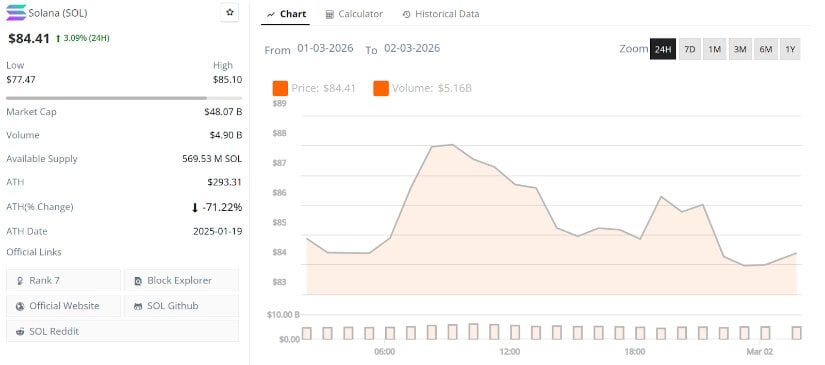 Solana现报84.41美元,24小时上涨3.09%。来源:Brave New Coin