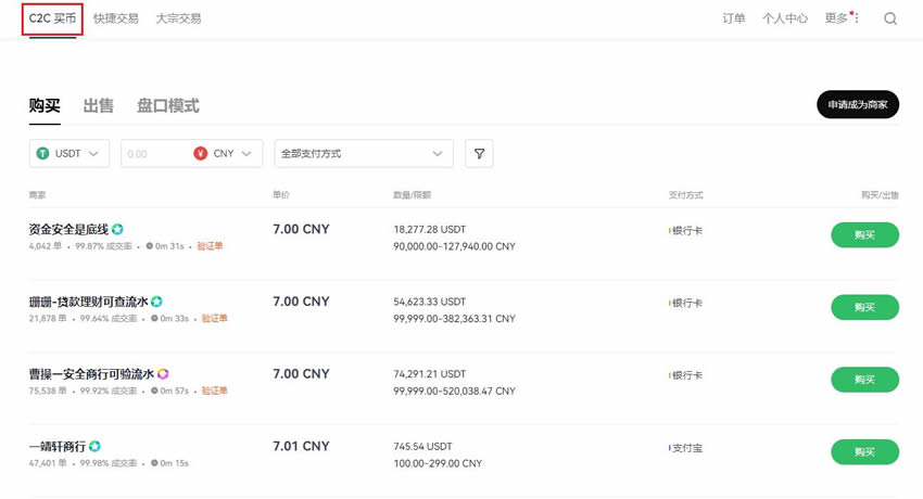 在首页导航栏选择"我要买币"功能,进入C2C交易专区。这里会展示多种法币与数字货币的交易对,包括HKD/USDT等常见组合。