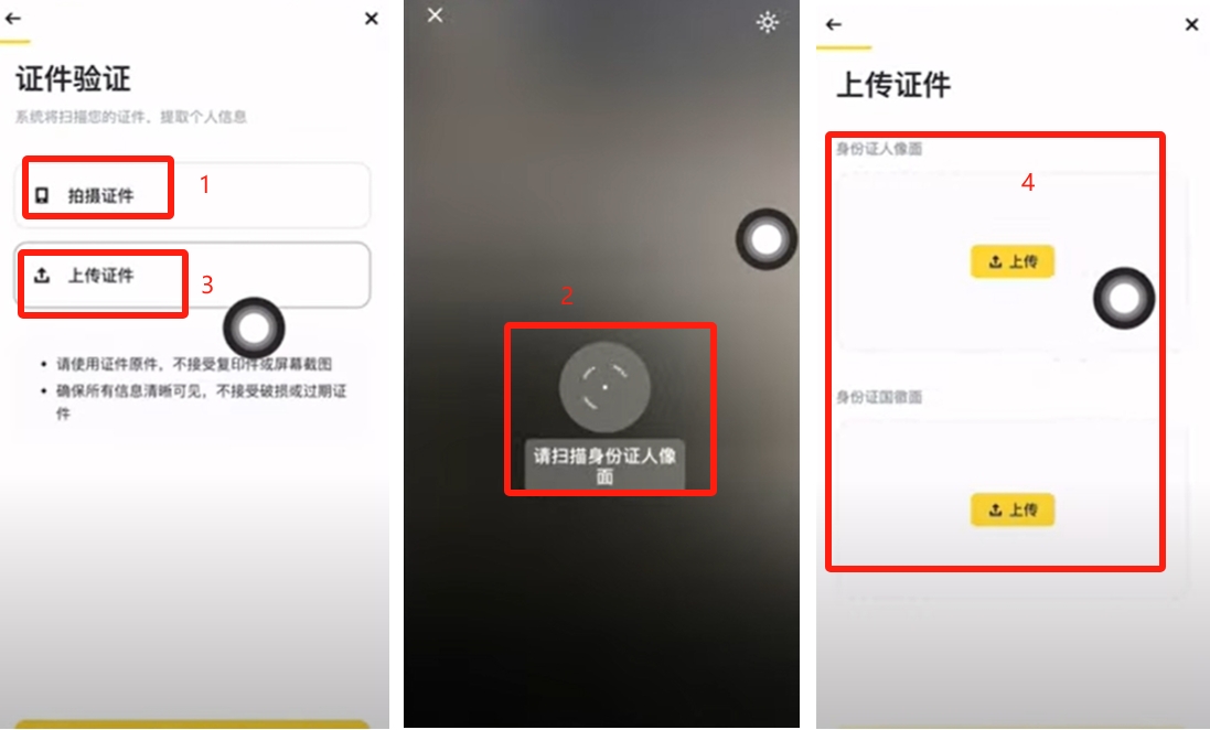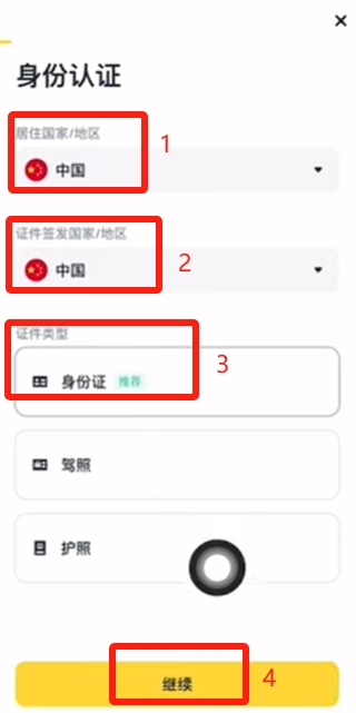 登录APP后进入验证页面,选择中国作为居住地和证件签发国。验证方式推荐使用身份 件,支持拍摄或上传证件正反面照片。