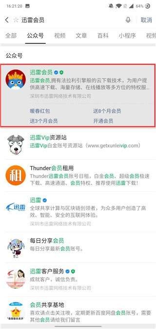 第一步:打开微信搜索"迅雷会员"公众号,点击关注后系统将自动推送欢迎信息。