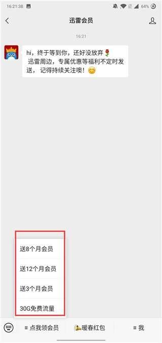 第二步:在公众号菜单栏找到"点我领会员"按钮,根据提示可选择领取3-12个月不等的会员时长。