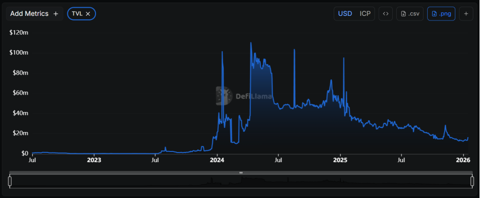 一是DeFi规模滞后。相较于以太坊或Solana,Internet Computer的DeFi生态规模仍有极大差距。截至 1月16日,其链上TVL仅约1,600万美元左右。